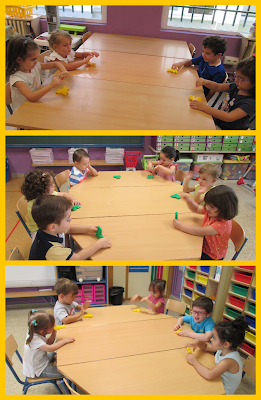 La seño ha cogido uno de nuestros juegos y nos ha repartido una pieza a cada uno. Le hemos echado nuestros polvillos mágicos y las hemos convertido en huesos de distintos sabores: amarillos como los plátanos y verdes como las manzanas. Seguro que con el calor que hace, estos huesos frutales refrescarán mucho a nuestro perrito. Y además son muy sanos, jaja.